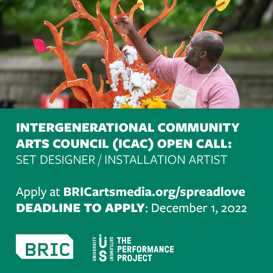 The Intergenerational Community Arts Council (ICAC) seeks an environmental designer, set designer, or installation artist to help create the visual, physical, and interactive elements for SPREAD LOVE, a pop-up performance event that will travel to four local community centers in May-June 2023. SPREAD LOVE is being created by an intergenerational crew of artists, performers, and producers. The performance is grounded in the unique cultural history of Downtown Brooklyn, and builds on the ICAC members’ commitment to support community health and wellness through artistic opportunities.