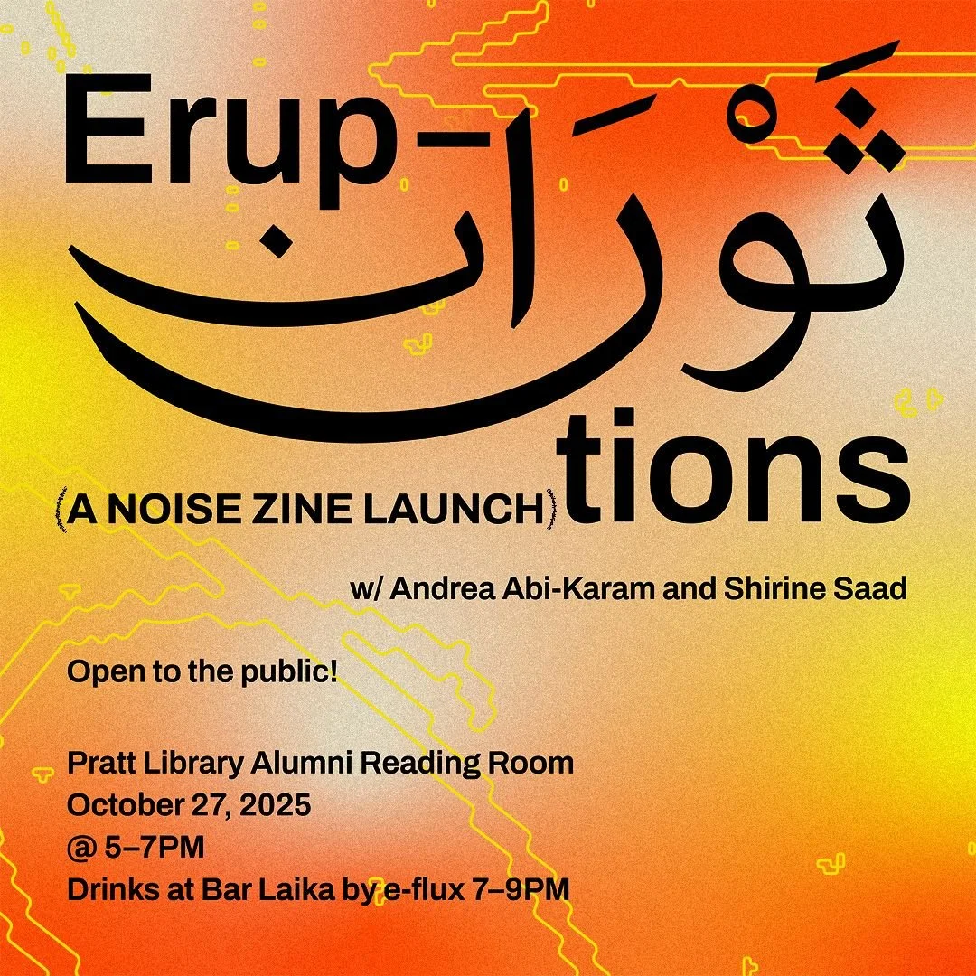 Please join us for the launch of a multimedia Noise Zine created by writer and DJ Shirine Saad with designer Randa Hadi. This project features radical feminist and queer poetics from the Arab world, ranging from experimental dance to poetry, music, photography, sculpture and film. Limited edition risograph prints will be offered, as well as snacks from Sahadis; Shirine will play a custom mixtape. Copresented by ArteEast and Arab Amp with the Humanities and Media Studies department at Pratt.