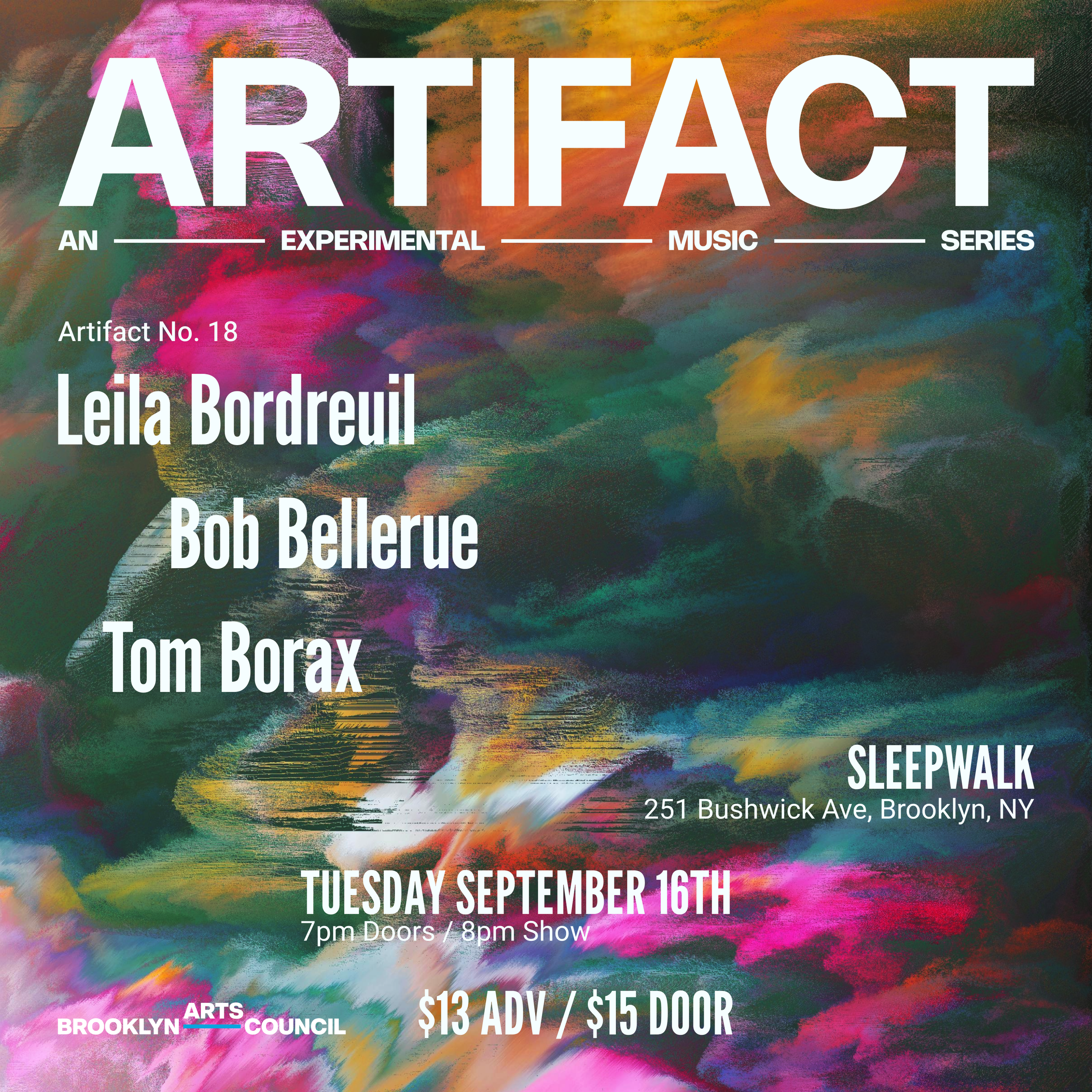 Artifact No. 18 showcases an evening focused on experimental drone, noise, and free improvisation. This month's iteration features the performers Leila Bordreuil, Bob Bellerue, and Tom Borax. Artifact is a monthly experimental music series curated by Brian Wenner and Matthew Ryals.