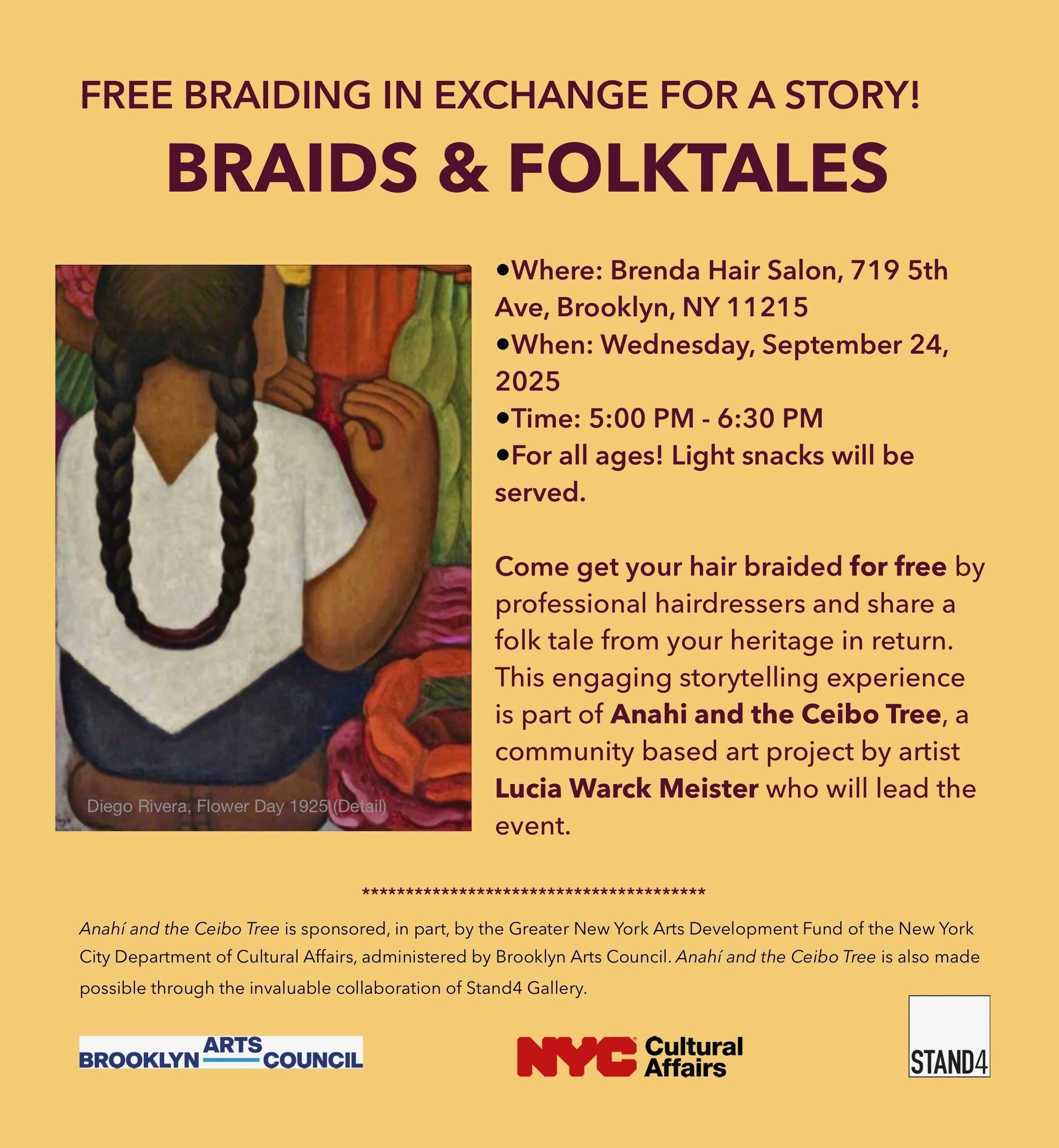Braids & Folktales is a welcoming and interactive community gathering where personal stories and cultural traditions intertwine. Guests are invited to receive a free braid from professional hairdressers in exchange for sharing a folktale from their heritage. Led by artist Lucia Warck-Meister as part of her project Anahí and the Ceibo Tree, the event transforms a neighborhood salon into a space of cultural exchange, where braiding becomes both a ritual of care and a metaphor for weaving memories together. Through storytelling, conversation, and the tactile art of braiding, participants of all ages connect across generations and cultures, preserving ancestral knowledge while creating new shared experiences.